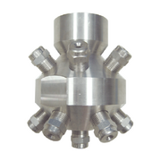 Seria dysz pełnostożkowych CH obejmuje dysze kumulacyjne przeznaczone do aplikacji wymagających szerokiego zasięgu natrysku, wysokiej wydajności oraz efektywnego rozbijania cieczy. Dysze te dostępne są w konfiguracjach obejmujących siedem lub trzynaście dysz, zintegrowanych na jednym kompaktowym korpusie o niewielkiej objętości. Zastosowanie kilku dysz w jednej konstrukcji sprawia, że dysze pełny stożek CH wytwarzają krople o wielkości od jednej trzeciej do jednej drugiej w porównaniu do kropli generowanych przez pojedynczą dyszę o tej samej wydajności. Takie rozwiązanie umożliwia uzyskanie bardziej jednorodnego natrysku, lepszego pokrycia powierzchni oraz wyższej skuteczności procesu przy zachowaniu dużego przepływu.