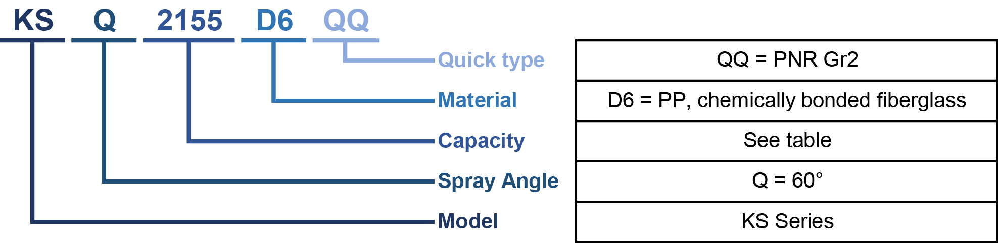 Różne natężenia przepływu są łatwo identyfikowalne dzięki kodowaniu kolorystycznemu, co umożliwia szybki i bezbłędny dobór odpowiedniej dyszy do danej aplikacji. Dysze KS/QQ wykonywane są z wysokiej jakości polipropylenu (PP) chemicznie wiązanego z włóknami szklanymi, co zapewnia: wysoką stabilność mechaniczną w podwyższonych temperaturach, bardzo dobrą odporność chemiczną, długą żywotność w wymagających środowiskach przemysłowych.